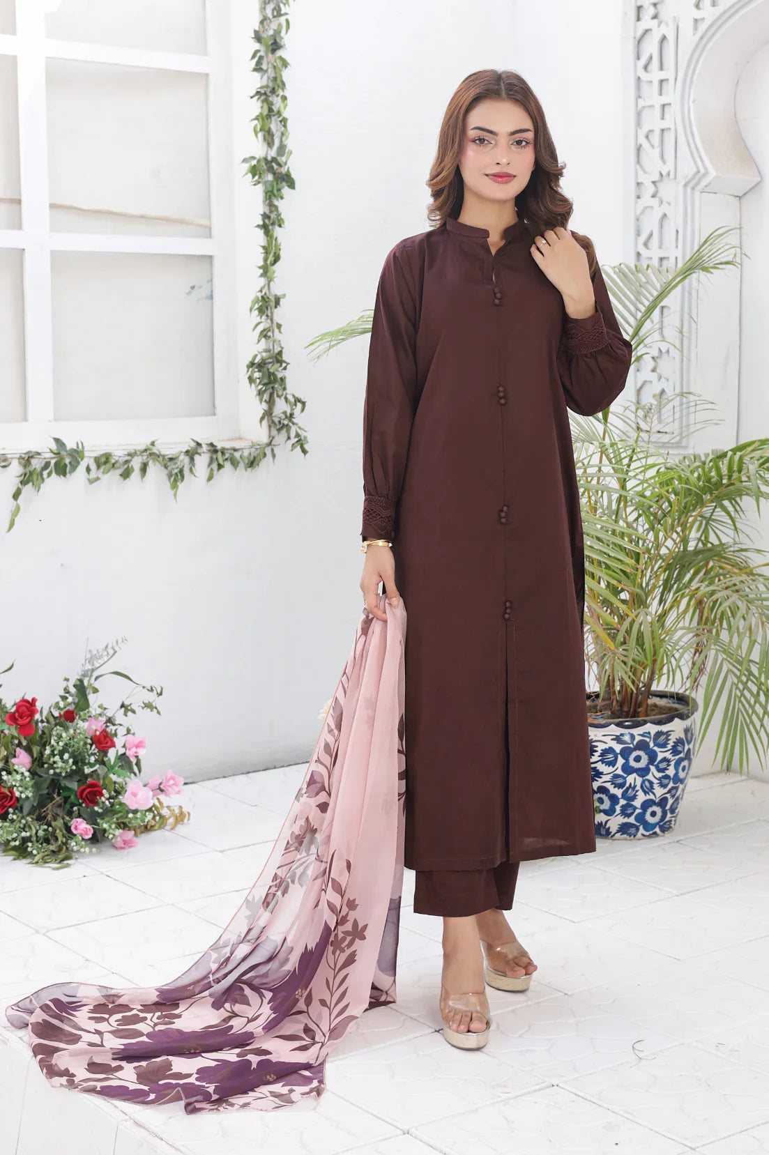 Soft cotton 3-piece set with delicate lace accents, tailored trousers, and digitally printed dupatta. Effortless comfort meets timeless style for everyday wear and special occasions alike.