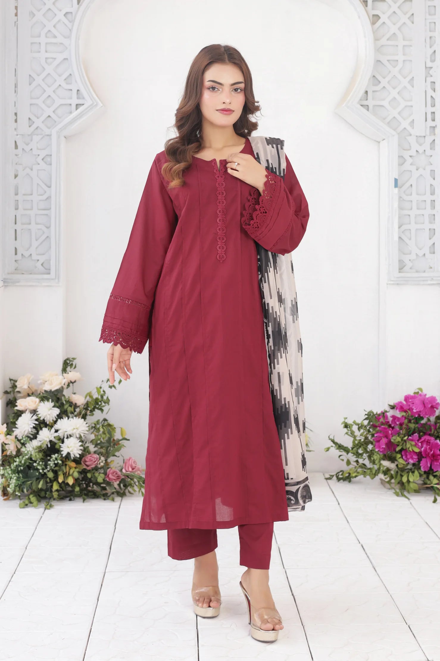 Maroon 3pc set in soft summer cotton featuring a pleated shirt with lace details, matching trousers, and a digital printed dupatta. Perfect for any occasion, combining comfort with traditional elegance.