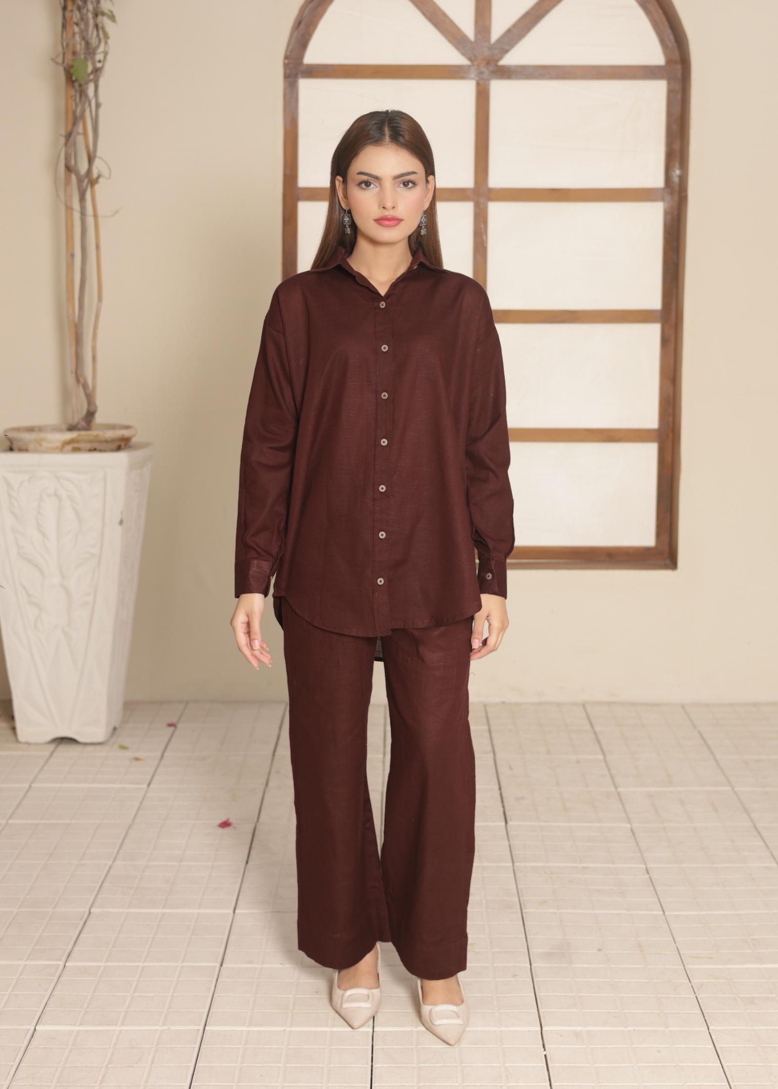 Upgrade your everyday style with our Solid Brown Khaddar Co-ord Set. Designed for warmth and durability, this outfit features a contemporary button-down shirt with cuffed sleeves and a curved hem, paired with comfortable matching trousers. The breathable yet cozy Khaddar fabric makes it an ideal choice for fall and winter wear. A monochrome essential that is easy to style and comfortable to wear all day.